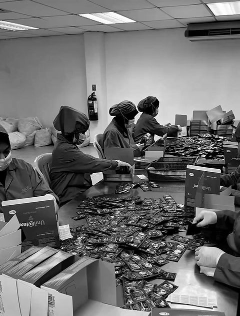 All of our condoms packed manually into 3's , 6's, 10's, 12's and 144's boxes. Our packing department has 1 unit of cello wrap machine and all the boxes are cello wrapped as per our client's requirement